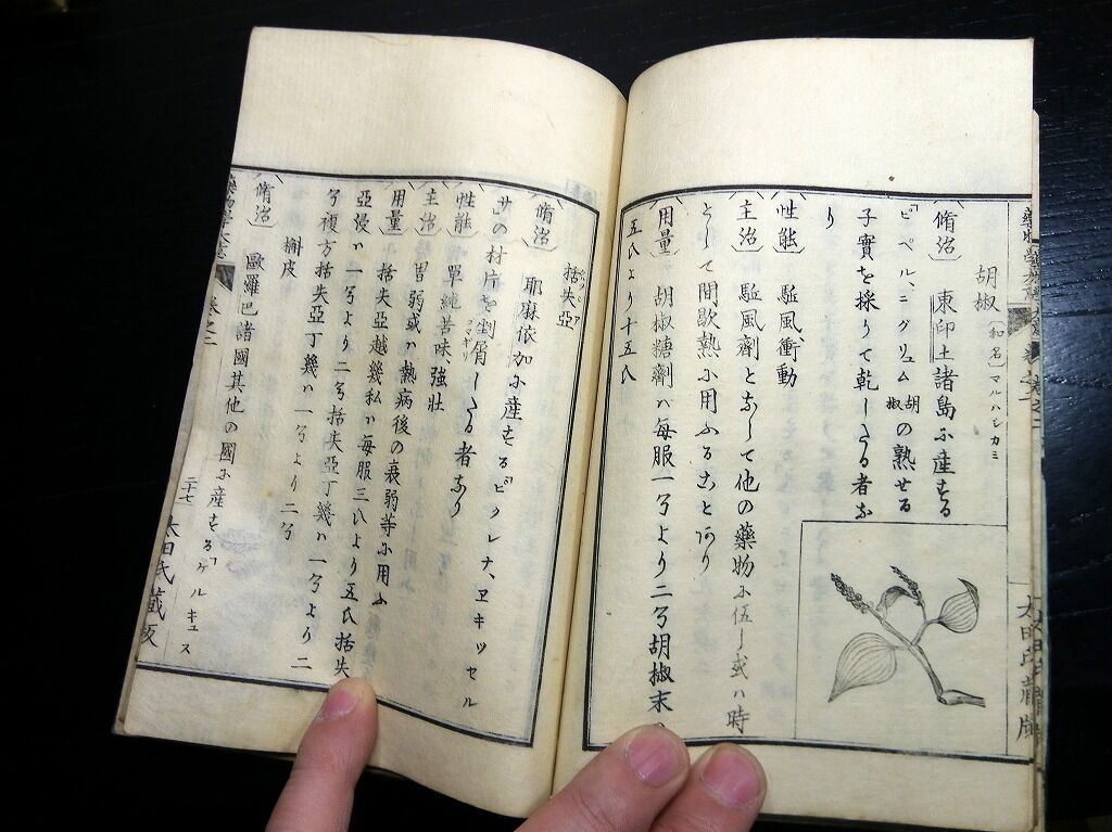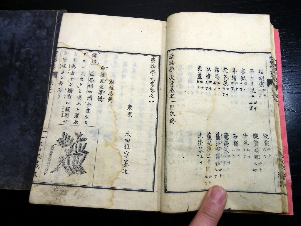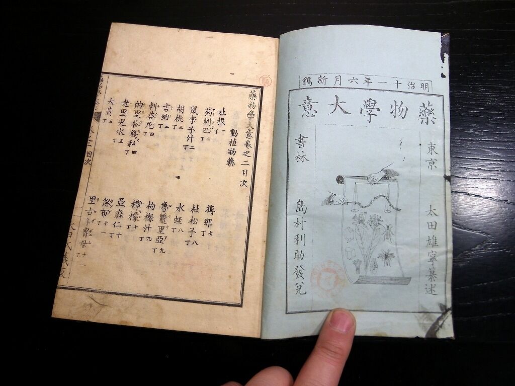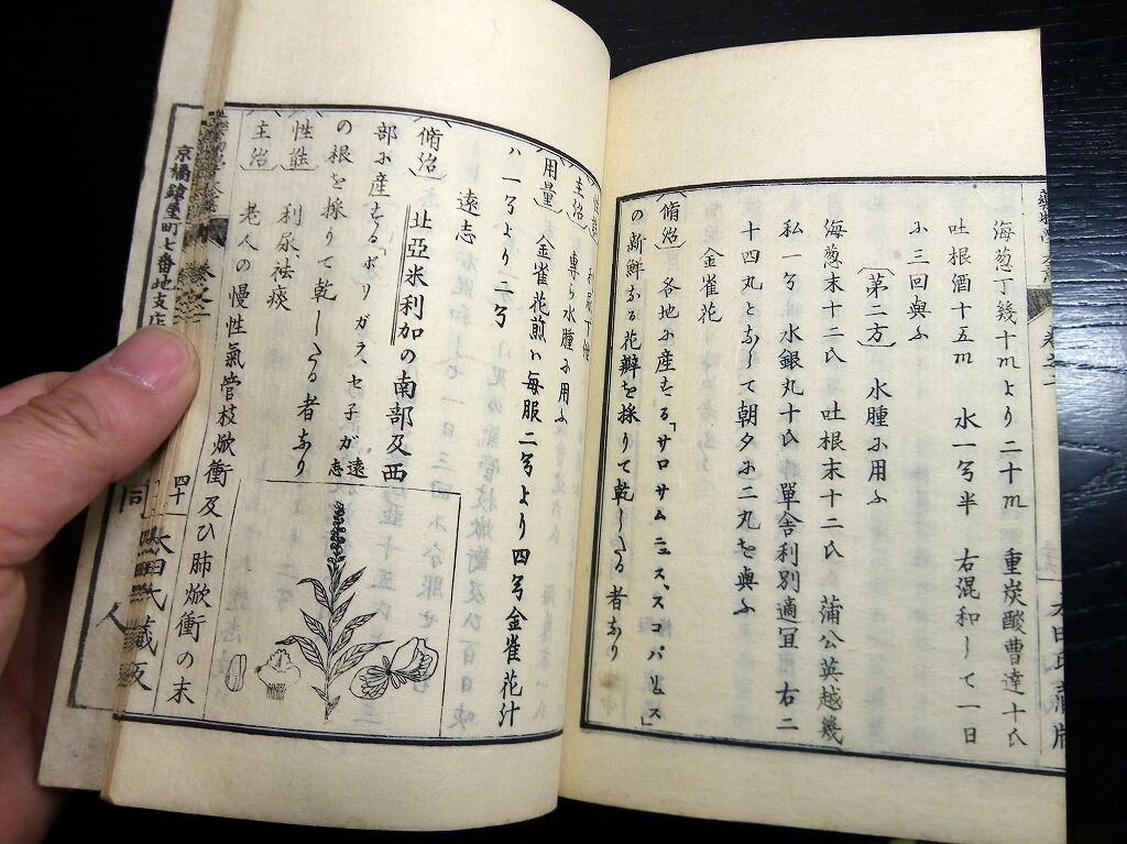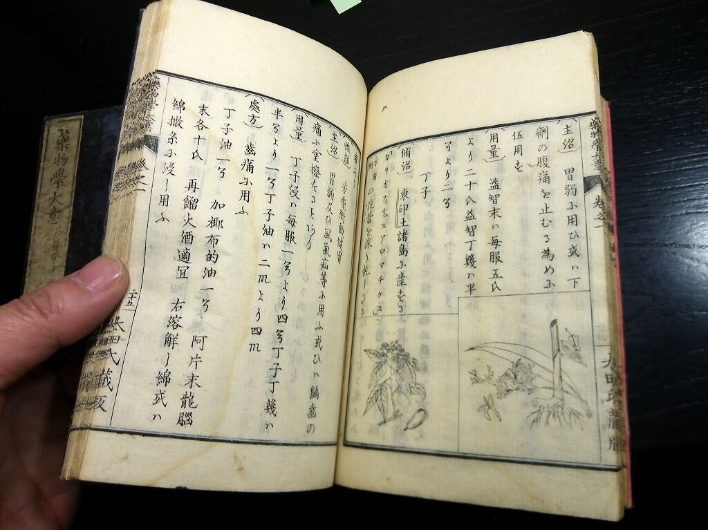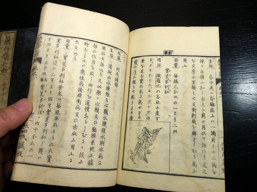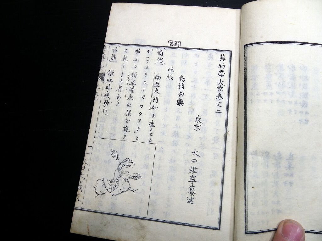 2020年02月04日 和本明治11年(1878)版本草学植物学西洋医学「薬物学大意」巻1,2の2冊揃い/太田雄寧/絵入古書古文書/木版摺り 和本明治11年(1878)版本草学植物学西洋医学「薬物学大意」巻1,2の2冊揃い/太田雄寧/絵入古書古文書/木版摺りです。 12+2+50、3+50丁。中本。木版刷り。元題簽。見返しあり。奥付あり。 『データ』 【書名】 薬物学大意 【巻冊】 巻1,2の2冊揃いです 【著者】 太田雄寧 【成立】 明治11年(1878)版 タグ :#和本#医学#薬学