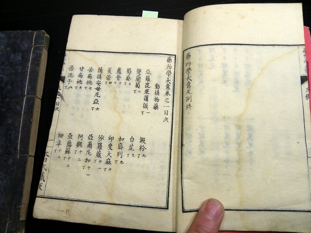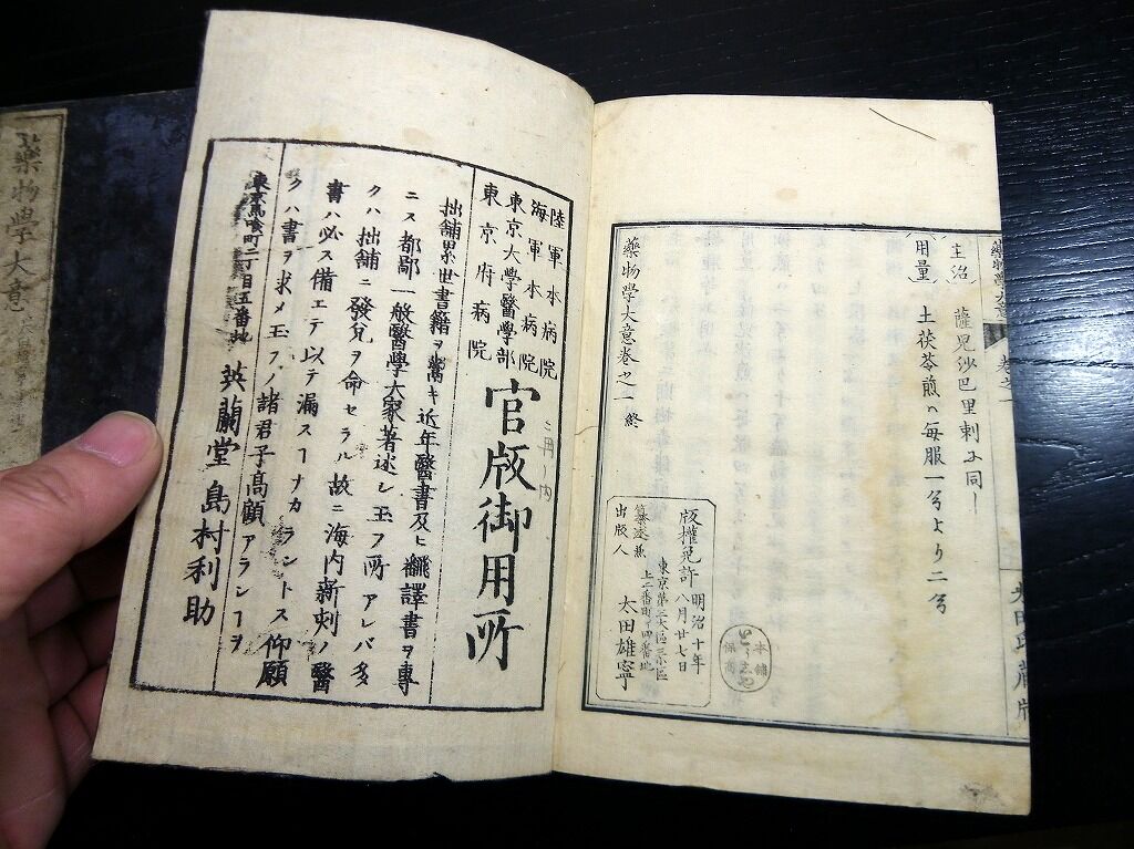 2023年11月19日 和本明治10年(1877)西洋医学薬学「新纂薬物学」附録共7冊揃い/樫村清徳/古書古文書/木版摺り 和本明治10年(1877)西洋医学薬学「新纂薬物学」附録共7冊揃い/樫村清徳/古書古文書/木版摺りです。2+4+4+54、3+38、2+35、4+60、2+54、4+39、45+2丁。22.5cm×15cm。木版刷り。元題簽。見返しあり。奥付あり。【書名】 新纂薬物学【巻冊】 附録共7冊揃い【著者】 樫村清徳 纂輯【成立】 明治10年(1877) タグ :#和本#医学#薬学#JAPAN#antiquebooks