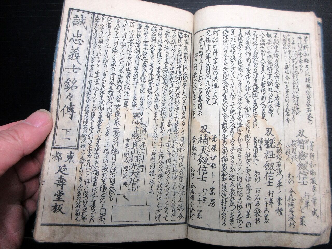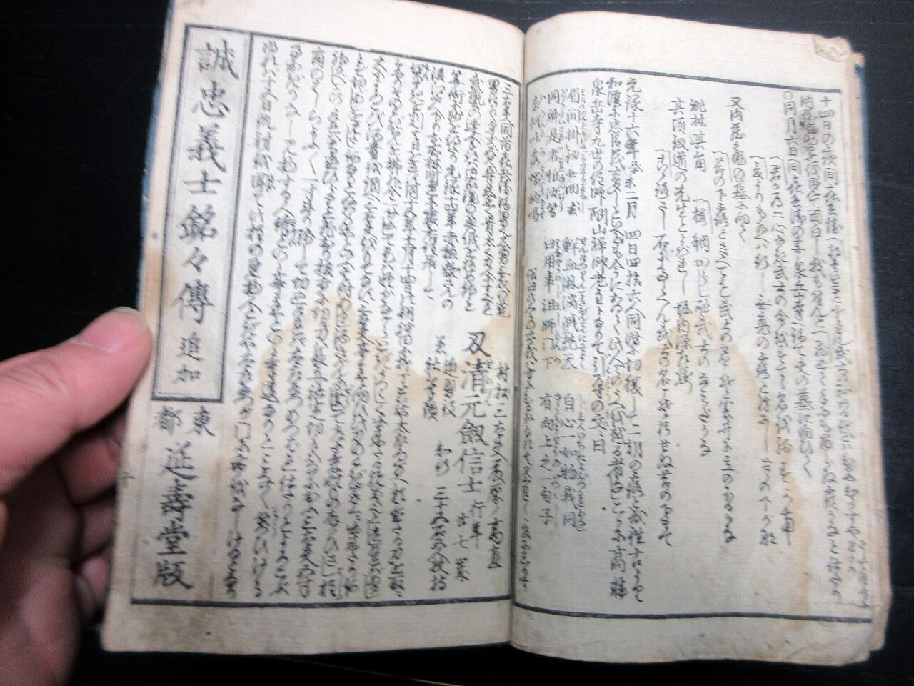 2024年05月23日 和本江戸嘉永4年(1851)跋赤穂浪士忠臣蔵「赤穂四十七士伝」上下2冊揃い/水戸佩弦斎蔵版/青山延光/古書古文書/木版摺り 和本江戸嘉永4年(1851)跋赤穂浪士忠臣蔵「赤穂四十七士伝」上下2冊揃い/水戸佩弦斎蔵版/青山延光/古書古文書/木版摺りです。2冊で51丁。25.5cm×17.5cm。木版刷り。見返しあり。奥付あり(刊年の記載なし)。【書名】 赤穂四十七士伝【巻冊】 上下2冊揃い【著者】 青山延光【成立】 嘉永4年(1851)跋 タグ :#和本#赤穂浪士#忠臣蔵#水戸#JAPAN#antiquebooks
