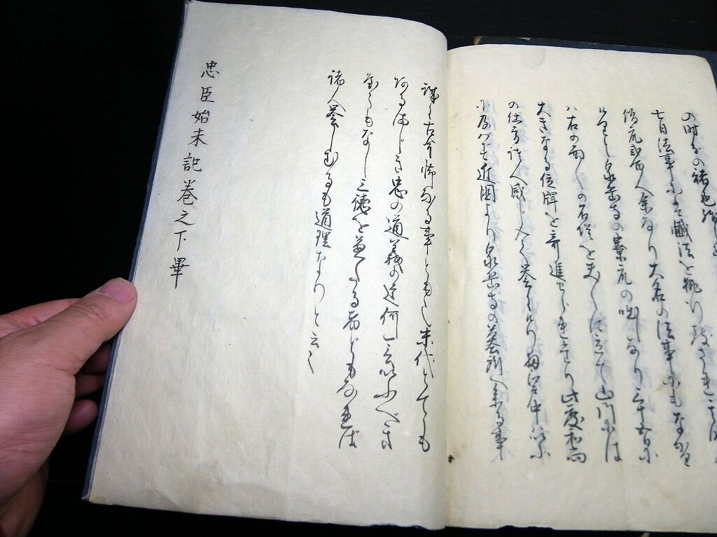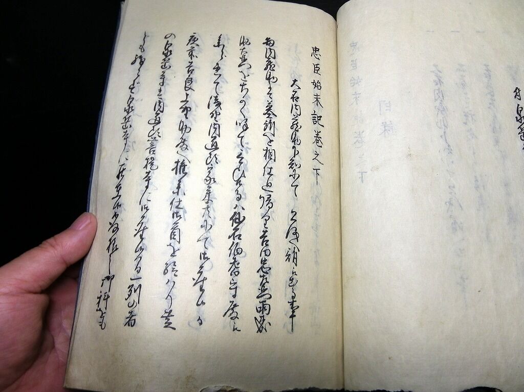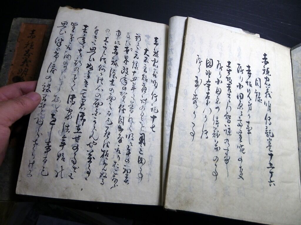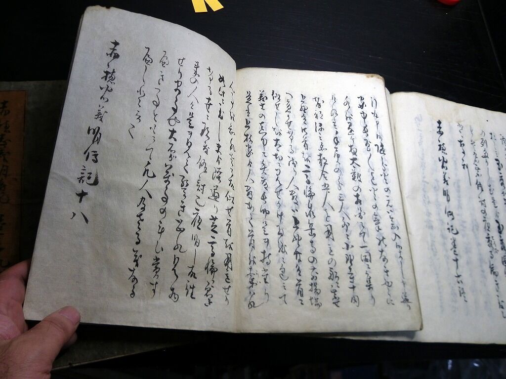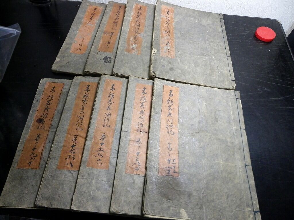 2021年06月16日 和本江戸弘化4年(1847)赤穂浪士忠臣蔵写本「赤穂忠義明伝記」9冊/古書古文書/手書き/信濃国水内郡北堀村 和本江戸弘化4年(1847)赤穂浪士忠臣蔵写本「赤穂忠義明伝記」9冊/古書古文書/手書き/信濃国水内郡北堀村です。37、28、30、30、27、27、21、20、25丁。大本程度。手書き。信濃国水内郡北堀村の記載がある『データ』【書名】 赤穂忠義明伝記【巻冊】 巻1,2で1冊、巻3,4で1冊、巻5,6で1冊、巻7,8で1冊、巻11,12で1冊、巻13,14で1冊、巻15,16で1冊、巻17,18で1冊、巻19,20で1冊の9冊です(全10冊のうち)【成立】 弘化4年(1847)写 タグ :#和本#写本#赤穂浪士#忠臣蔵