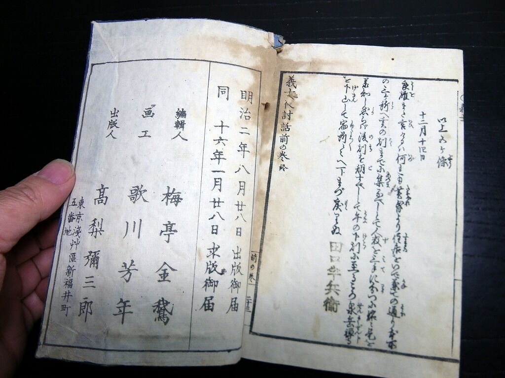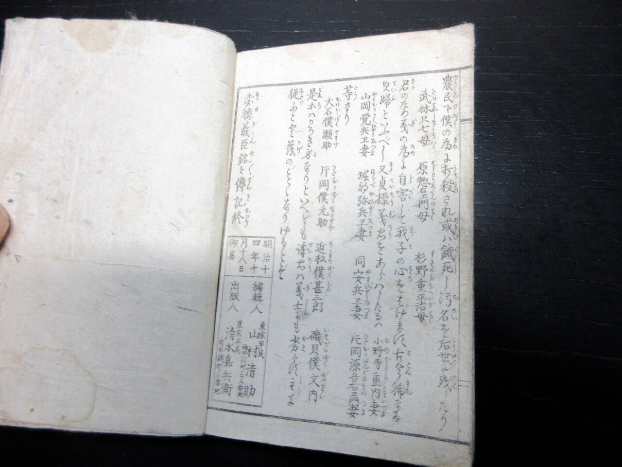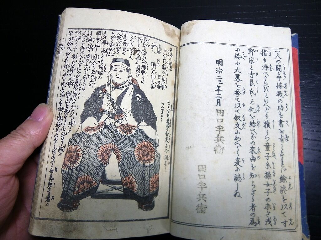2022年02月05日 明治19年(1886)ボール表紙「絵本赤穂義士銘々伝」全1冊/福井淳/絵入古書 明治19年(1886)ボール表紙「絵本赤穂義士銘々伝」全1冊/福井淳/絵入古書です。120頁。17.5cm×12cm。奥付あり。『データ』【書名】 絵本赤穂義士銘々伝【巻冊】 全1冊【著者】 福井淳【成立】 明治19年(1886) タグ :#古書#ボール表紙#忠臣蔵#赤穂浪士