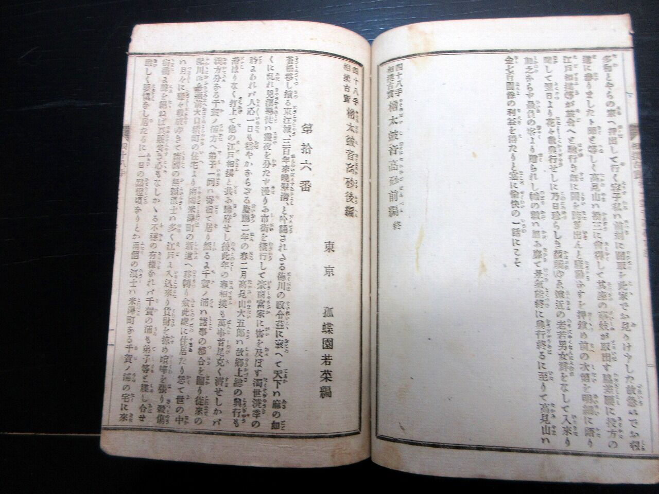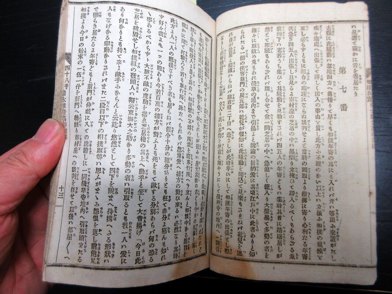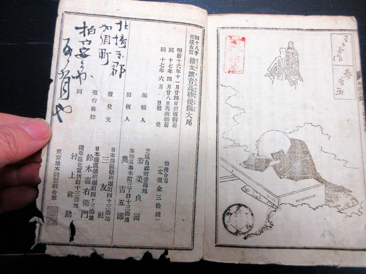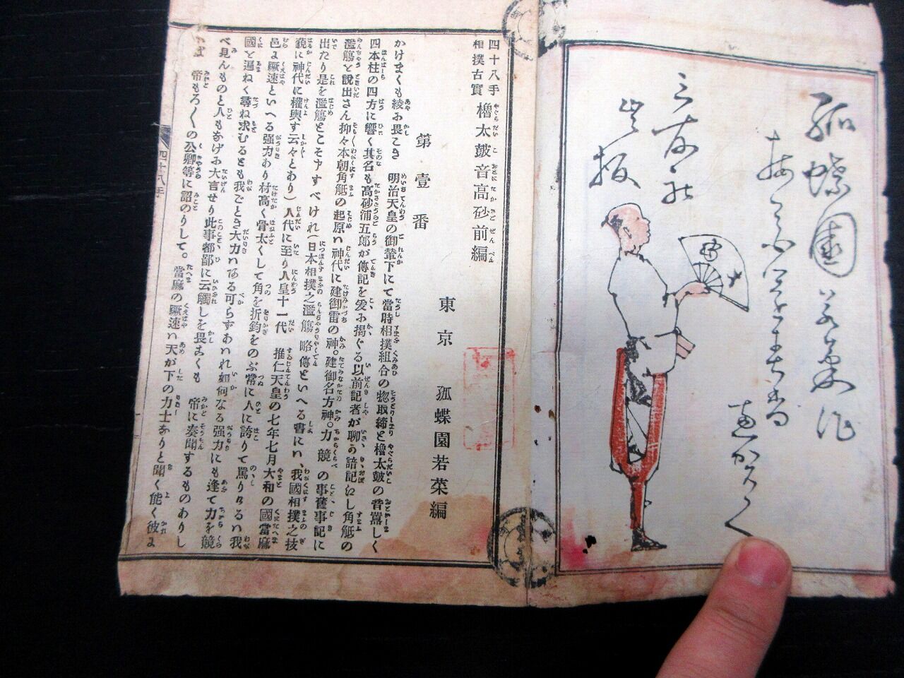 2025年01月11日 和本明治17年(1884)古書「四十八手相撲古実/櫓太鼓音高砂」全1冊/狐蝶園若菜 和本明治17年(1884)古書「四十八手相撲古実/櫓太鼓音高砂」全1冊/狐蝶園若菜です。29+30丁。18cm×12cm。表紙は木版刷り。本文は和紙に活版。奥付あり。【書名】 四十八手相撲古実/櫓太鼓音高砂【巻冊】 全1冊【著者】 狐蝶園若菜【成立】 明治17年(1884) タグ :#和本#古書#JAPAN#antiquebook#浮世絵#日本の古本屋#大江戸骨董市
